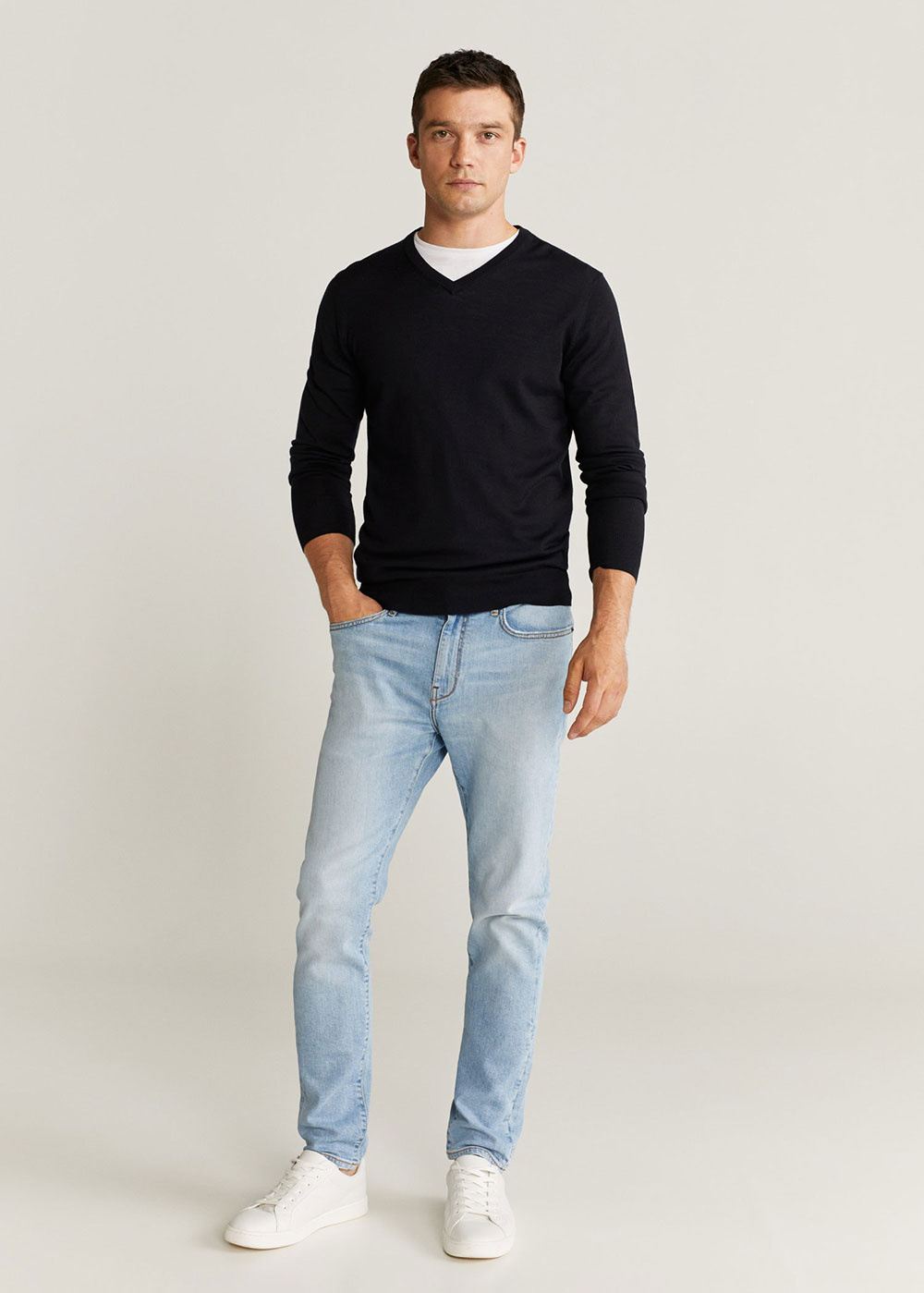 Lapel with notch. Back slit. Two pockets with flaps on the front. Button up.